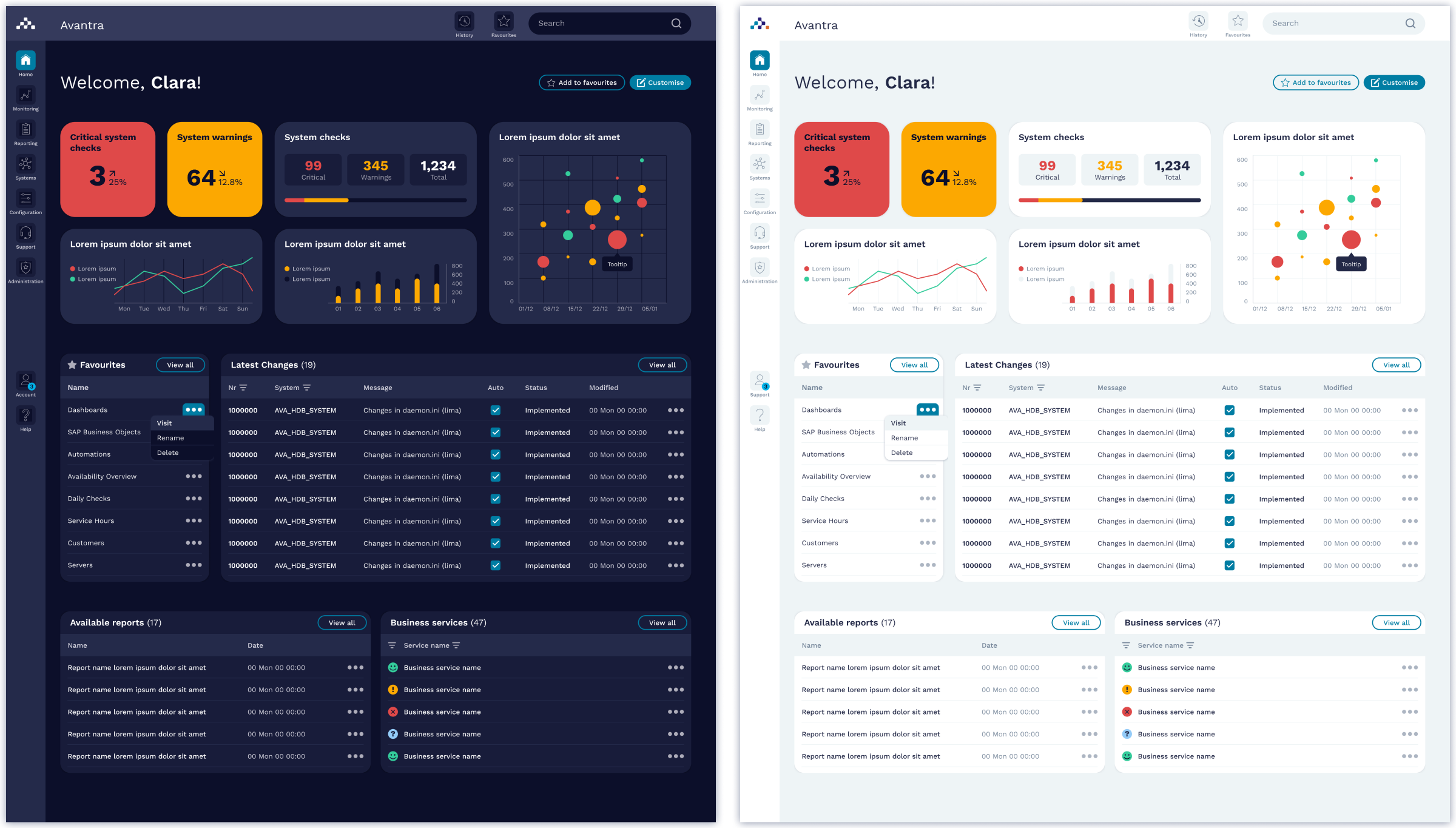 Once the structure and functionality for the priority templates were signed off, I worked alongside two other UI designers to create three conceptual directions for the interface design. Avantra selected my concept so I was assigned to lead on subsequent development, including light and dark modes and a basic mobile app design.