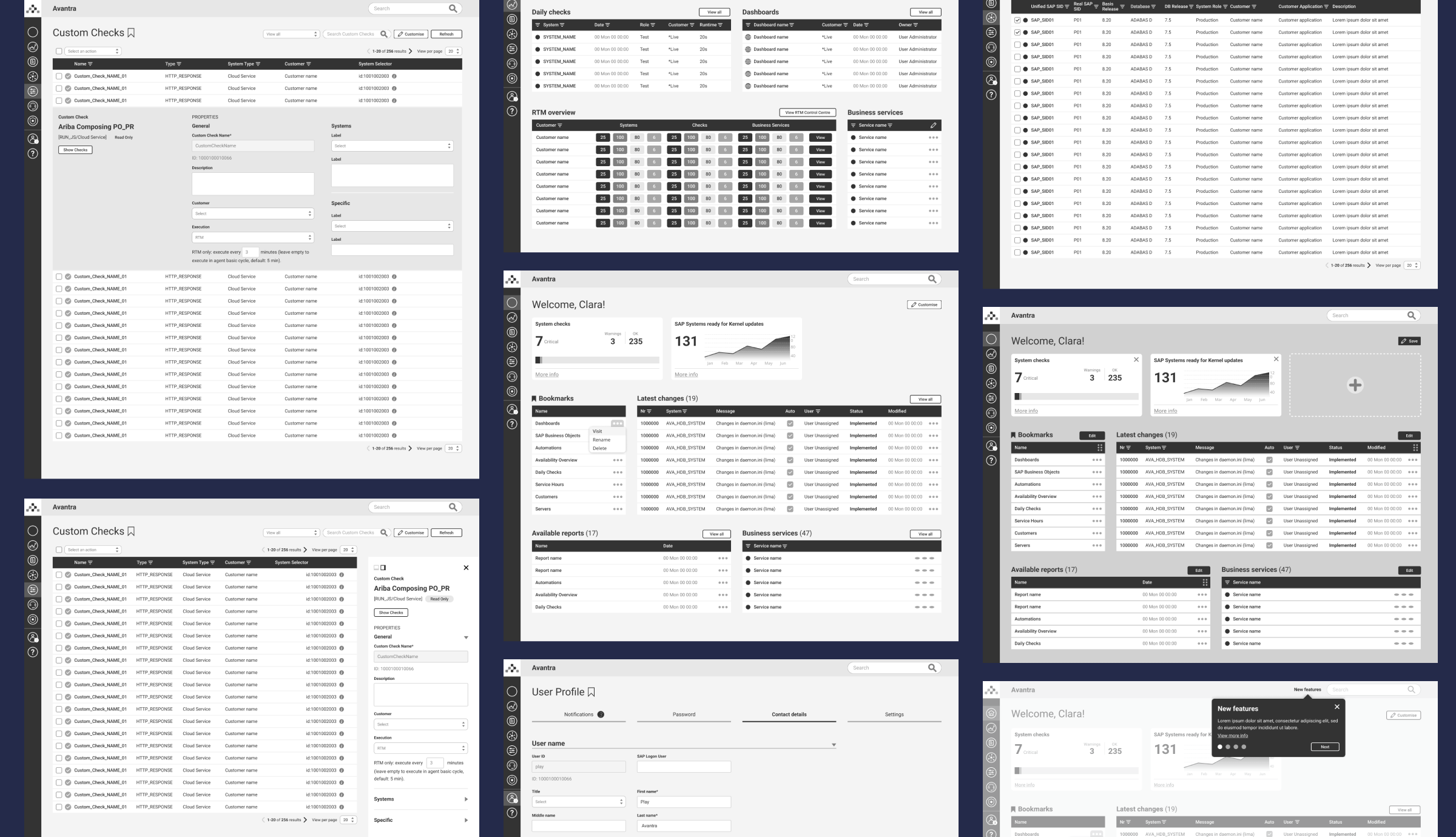 The research team conducted a series of nine stakeholder interviews and identified a set of priority tasks for each of the four user groups. We noticed that there was little overlap between their preferences and priorities. For example, an enterprise CIO needs a top-level overview of the system’s health and relevant alerts, while an SAP consultant requires a much more in-depth picture with quick access to all system layers, reporting tools and automation capabilities. This divide highlighted the need for a customisable dashboard that can be easily modified to serve the different users’ needs.