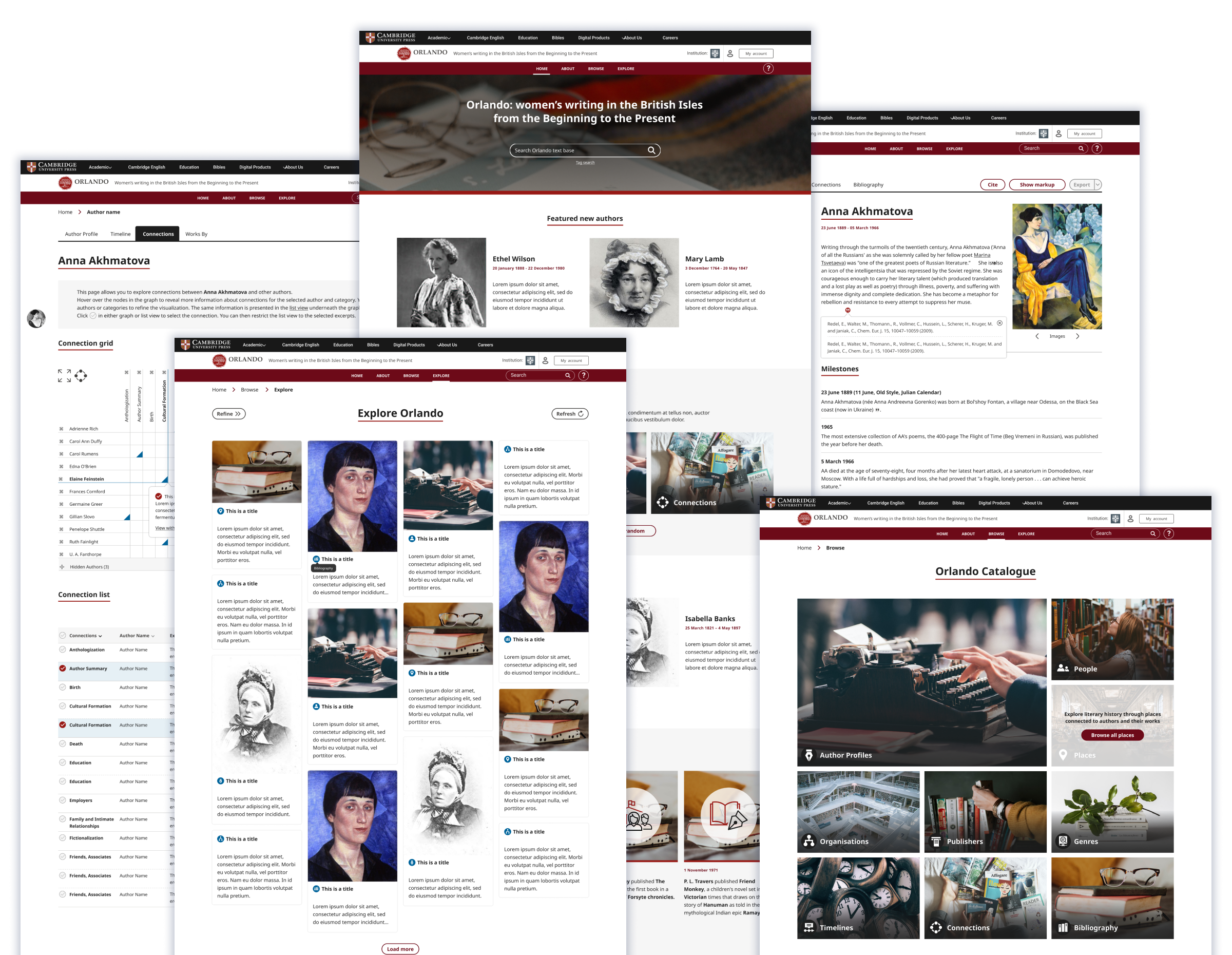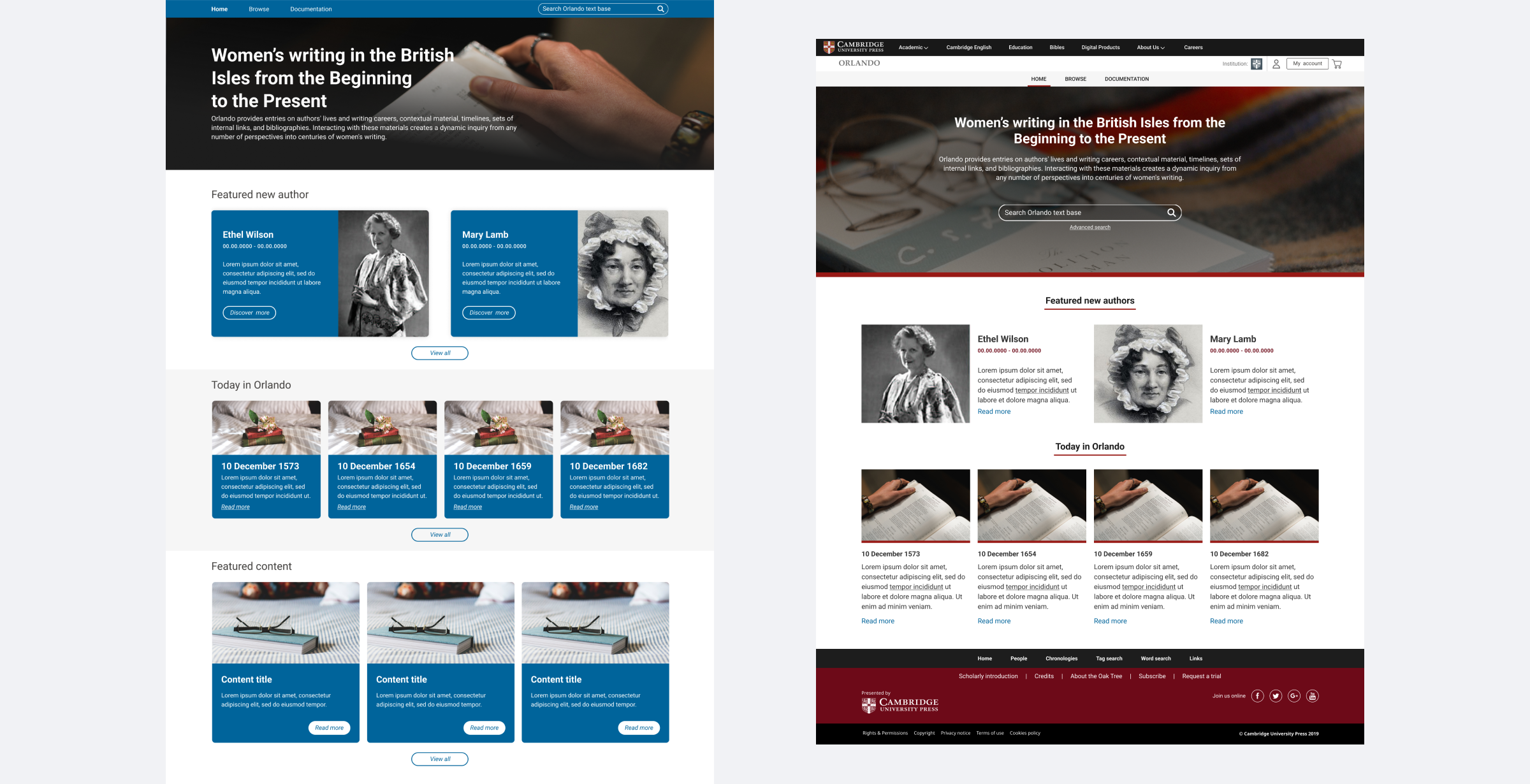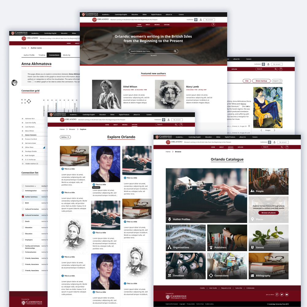 Once the structure, functionality and content of the templates were finalised, I created two variations of the interface design. The layout, typography and navigation were based on The Orlando Project’s parent organisation Cambridge Academic, and I used colour, images and interactive principles to give the site a unique brand identity.