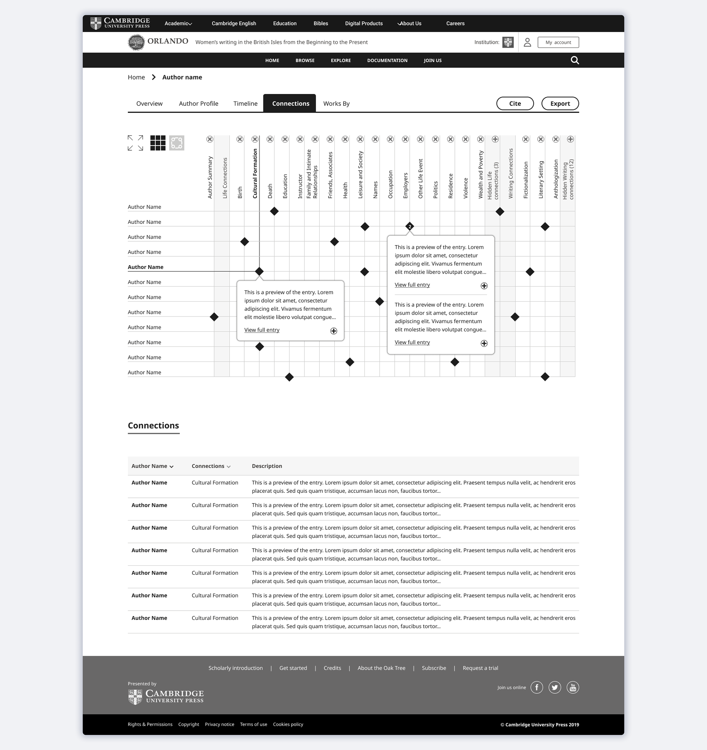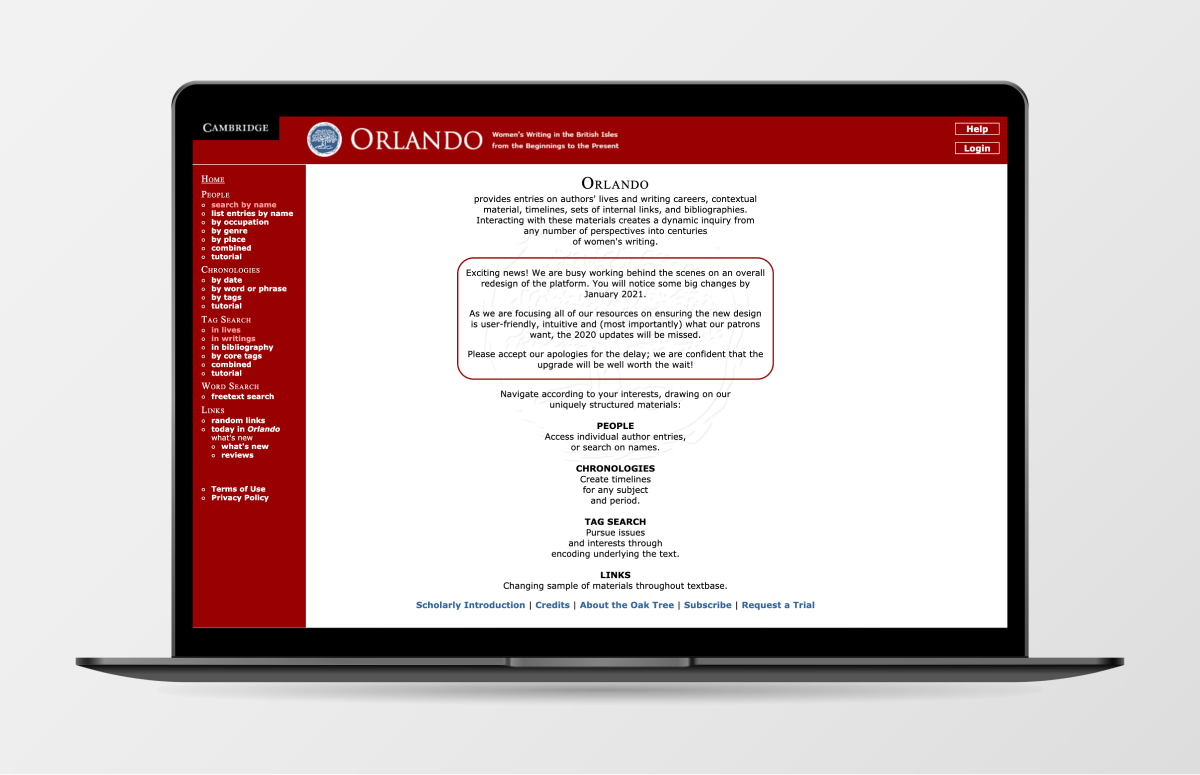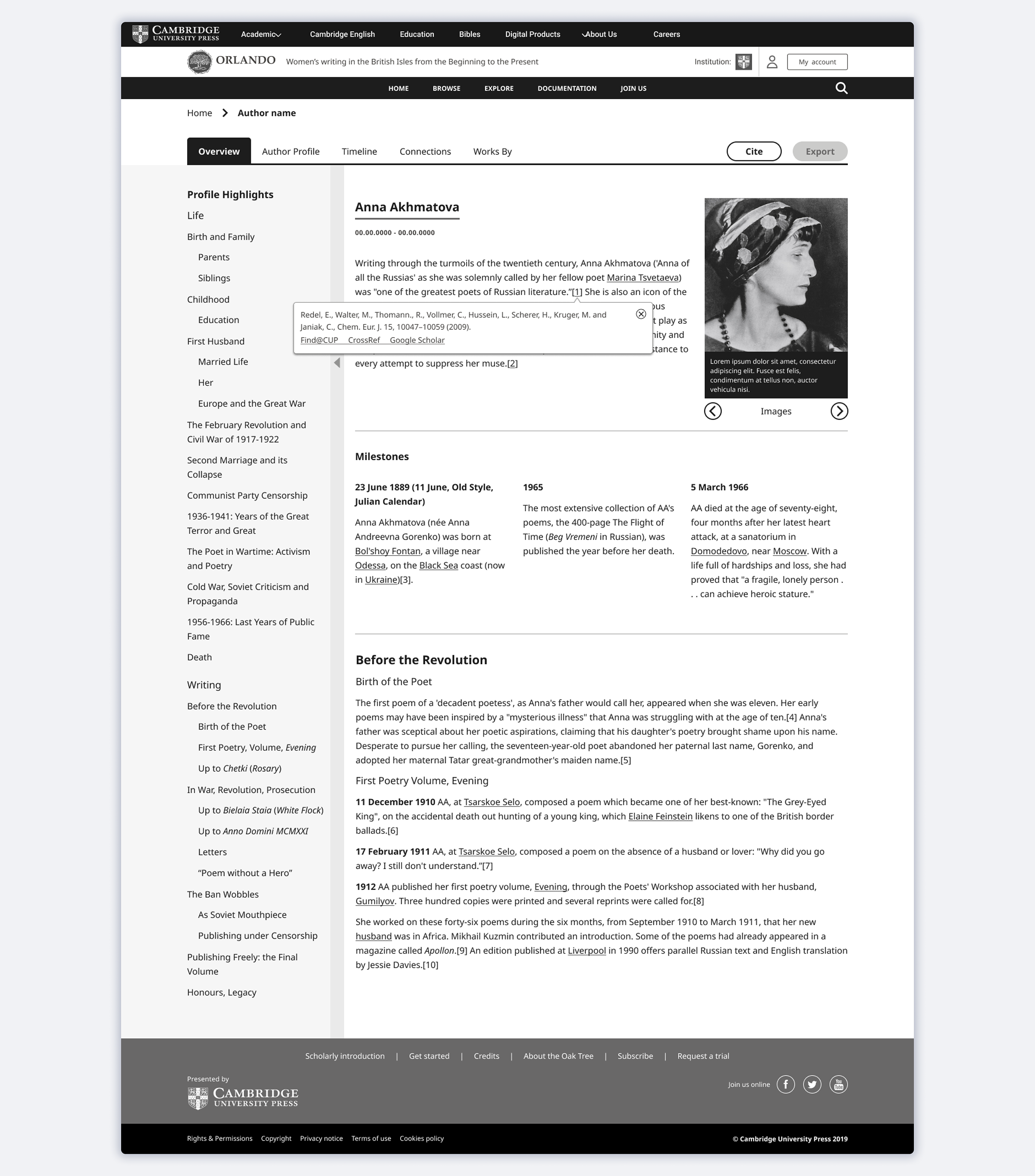 Once the structure, functionality and content of the templates were finalised, I created two variations of the interface design. The layout, typography and navigation were based on The Orlando Project’s parent organisation Cambridge Academic, and I used colour, images and interactive principles to give the site a unique brand identity.