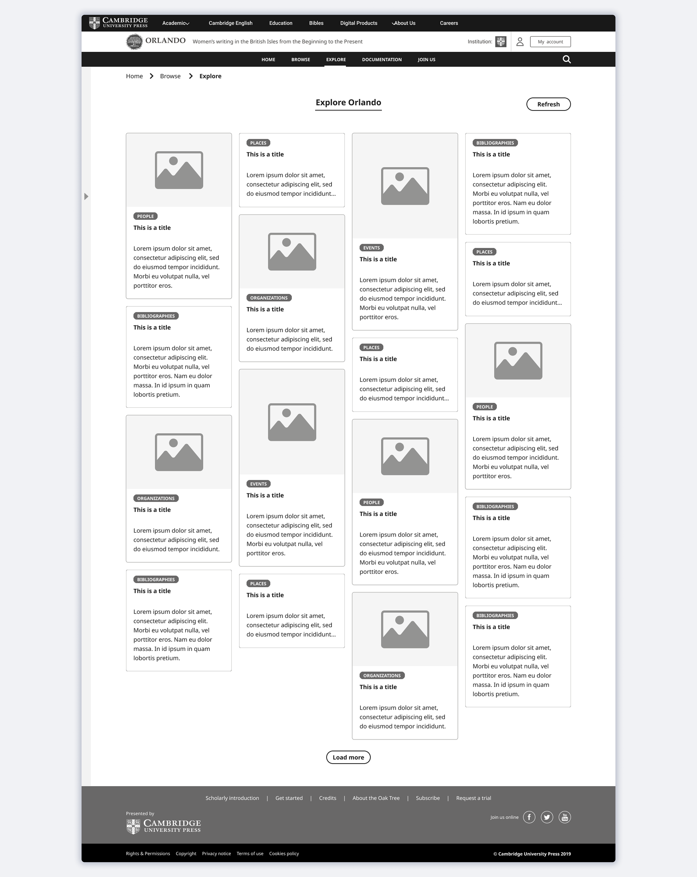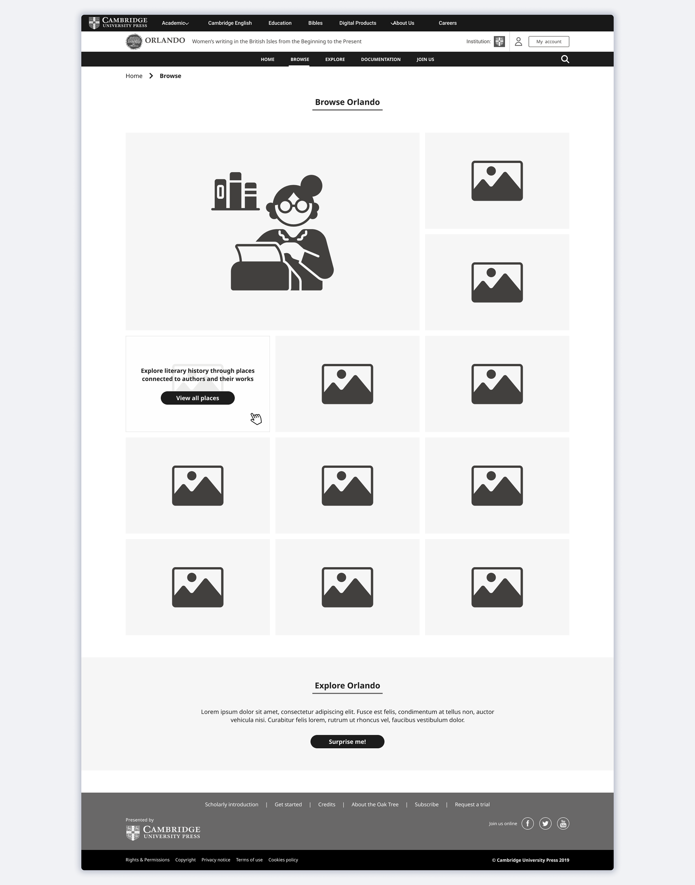Over a six month period, I worked on the structure, functionality and appearance of the six priority page templates, enhancing the search capabilities and aligning the experience with Orlando’s parent organisation, Cambridge Academic.